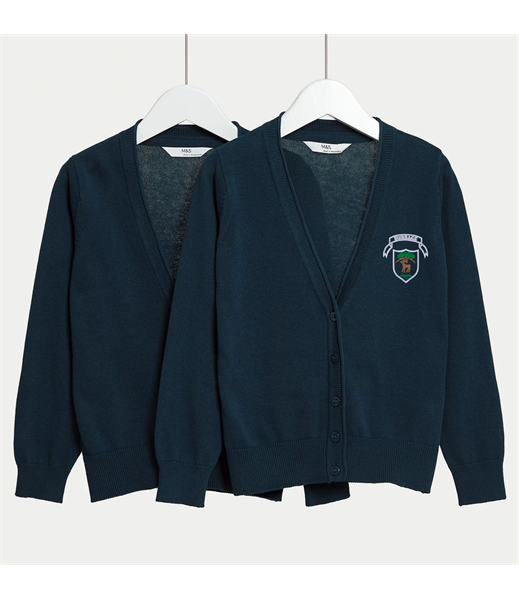 These are M&S pure cotton cardigans in a handy pack of two so you always have a spare. They are made of responsibly sourced pure cotton for extra comfort and have the M&S StayNEW™ technology which reduces bobbling and colour loss, keeping clothes looking newer and brighter for longer. The school logo is added at our unit.